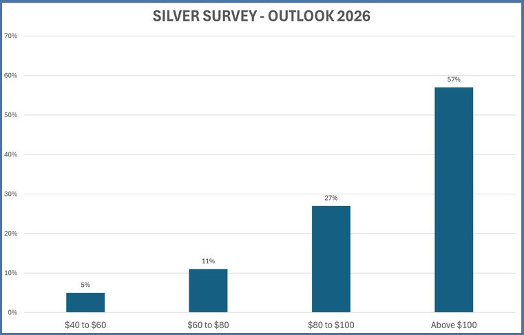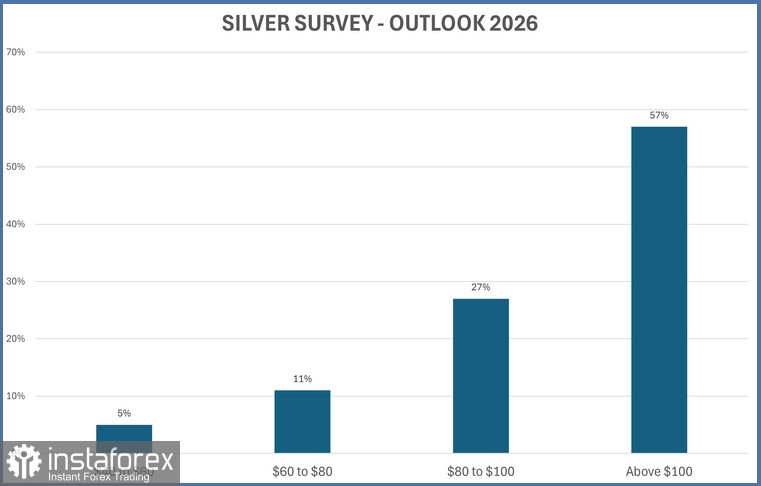На закончившейся неделе в опросе о серебре приняло участие 176 розничных инвесторов, и почти большинство участников рынка прогнозируют, что в 2026 году цена превысит $100 долларов за унцию.