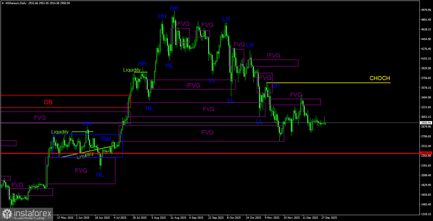 Эфир на дневном ТФ продолжает формирование нисходящей тенденции. В ходе обвала в «черную пятницу» был отработан первый из «бычьих» FVG, в ходе «черного вторника» был отработан второй «бычий» FVG, в ходе последнего витка падения – третий «бычий» FVG. Структура тенденции в данное время понятна, как день, и не вызывает никаких вопросов. Линия CHOCH проходит по уровню 3 666$ – последний LH(Lower High). До тех пор, пока цена находится ниже нее, нисходящий тренд сохраняется. Восходящая коррекция могла уже завершиться, так как эфир достиг свой единственный неотработанный «медвежий» FVG и получил недвусмысленную реакцию с подтверждением на младшем ТФ. Но сейчас на рынке – рождественская/новогодняя пауза.