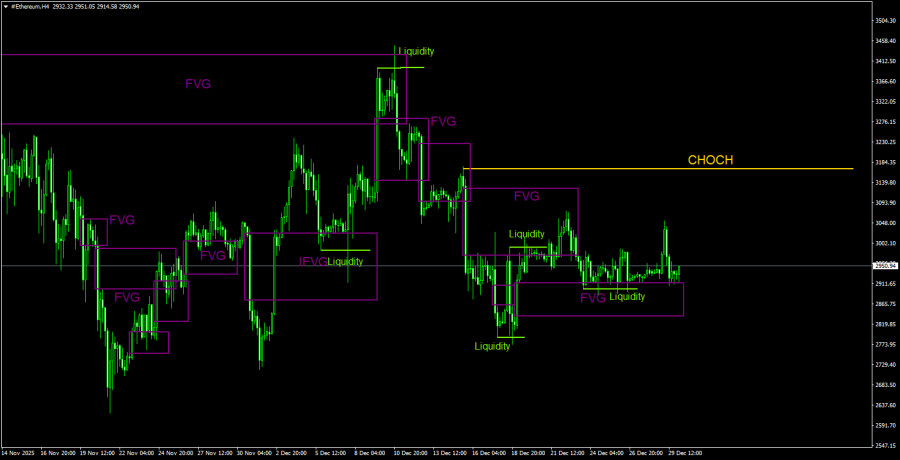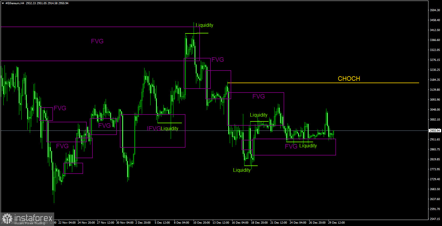 В мире продолжаются новогодние праздники, поэтому желающих активно торговать немного. Понижательные перспективы сохраняются, но в данное время рынок абсолютно не спешит с открытием новых позиций. Эфир оттолкнулся от «бычьего» FVG на 4-часовом ТФ уже раза 4, а также снял несколько раз ликвидность на покупку. Небольшой рост мы увидели, на большее – сил и желания у рынка явно нет.