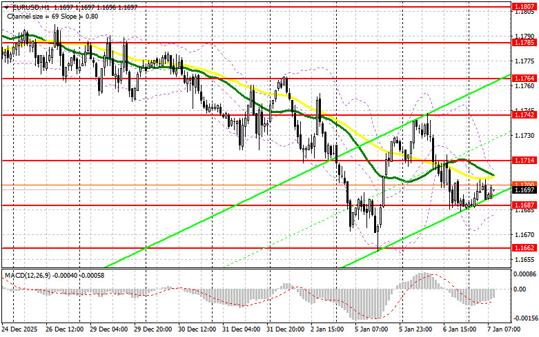 Несмотря на то, что индекс PMI для сферы услуг США оказался ниже прогнозов экономистов, американский доллар сумел укрепить свои позиции против евро. Не отпугнули покупателей доллара и заявления Стивина Мирана о том, что ФРС необходимо и дальше активно снижать процентные ставки. Сегодня в первой половине дня ожидаются цифры по изменению числа безработных Германии, уровню безработицы, а также индексу потребительских цен еврозоны за декабрь этого года. Учитывая, что с инфляцией в еврозоне все в полном порядке, вряд ли можно рассчитывать на крупные рост евро в первой половине дня. В случае негативной реакции на цифры и падения пары, первого проявления покупателей ожидаю в районе ближайшей поддержки 1.1687. Только формирование там ложного можно даст точку входа в длинные позиции с целью небольшого восстановления к 1.1714. Прорыв и обратный тест этого диапазона станут подтверждением правильных действий на покупку евро уже в расчете на более крупный рывок к 1.1742. Самой дальней целью выступит максимум 1.1764, где буду фиксировать прибыль. Тест этого уровня вернет бычий рынок по евро. При варианте снижения EUR/USD, и отсутствия активности в районе 1.1687, давление на пару вернется, что может привести к более крупному движению евро вниз. В таком случае медведи попытаются дотянуться до следующего интересного уровня 1.1662. Лишь формирование там ложного пробоя будет подходящим условием на покупку евро. Открывать длинные позиции сразу на отскок будут от 1.1641 с целью восходящей коррекции в 30-35 пунктов внутри дня.