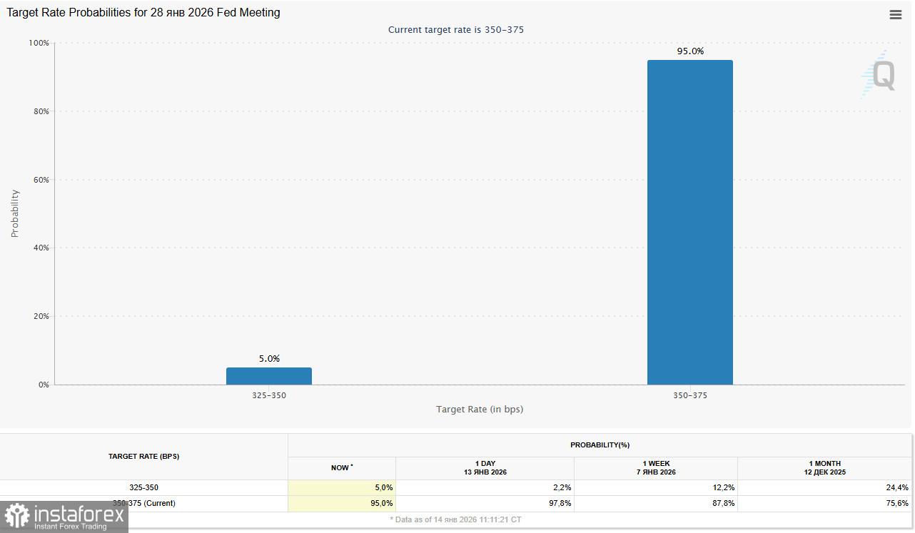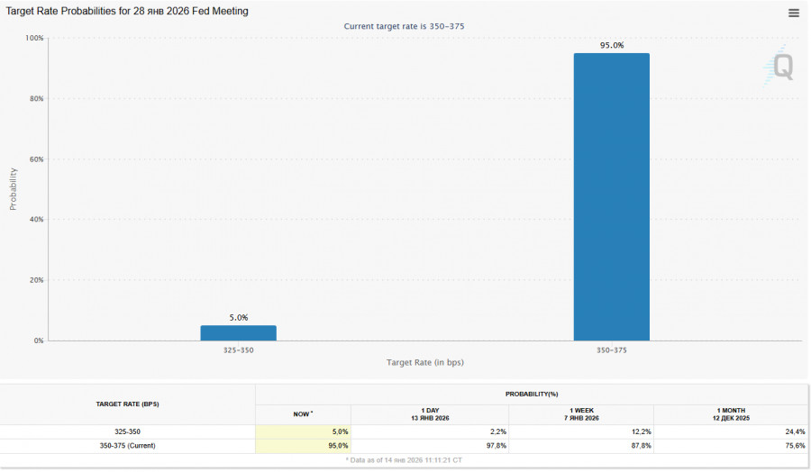Эти данные укрепили ожидания, что ФРС сохранит процентные ставки без изменений в ближайшие месяцы. Инструмент CME FedWatch оценивает вероятность снижения ставок в январе всего в 5%.