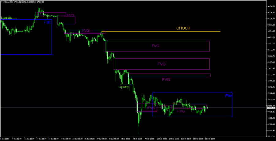 На 4-часовом таймфрейме цена также продолжает формирование нисходящей структуры. Линия CHOCH проходит на уровне 90 560$, только выше нее можно будет говорить о преобразовании тренда в восходящий. Однако на данный момент нет никаких признаков того, что биткоин может завершить падение в ближайшее время. Все последние паттерны FVG не дали никакой ощутимой реакции. Мы считаем, что в данное время на 4-часовом ТФ сформировался флэт. Следовательно, торговые позиции можно рассматривать только в случае образования девиаций, которых в последнее время тоже не было ни одной.