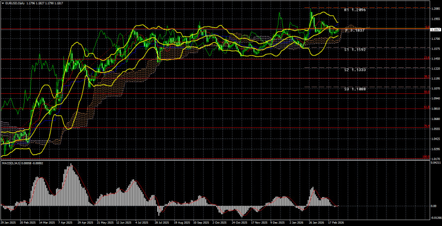 Валютная пара EUR/USD в течение пятницы вновь не продемонстрировала никаких интересных движений. В принципе, в течение всей текущей недели наблюдалась очень слабая волатильность, которая не позволяла трейдерам открывать торговые сделки на таймфреймах старше 5-минутного. На иллюстрации ниже отлично видно, что волатильность вновь начала падать в конце январ, и в течение всего февраля буквально несколько дней имело высокий показатель волатильности. Что касается текущей недели, то в среднем цена проходил за день 52 пункта... Самое интересное, что никто не может заявить