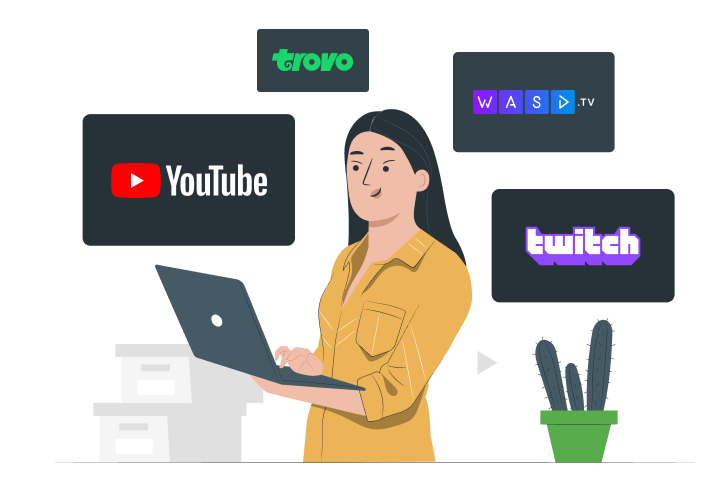 Our streamers can broadcast via mobile devices and PCs using any platform such as YouTube, Twitch, VK, Zoom, Skype, GoogleMeet, etc.
