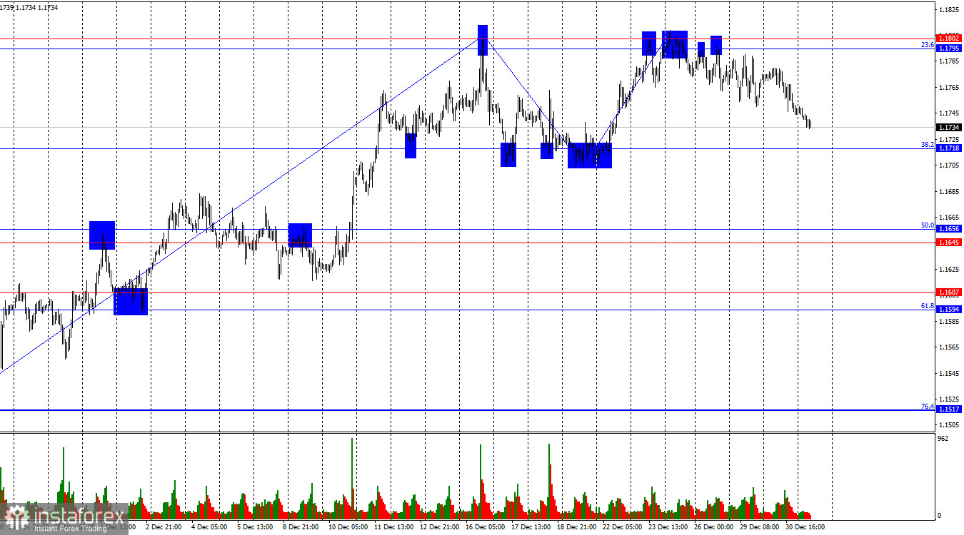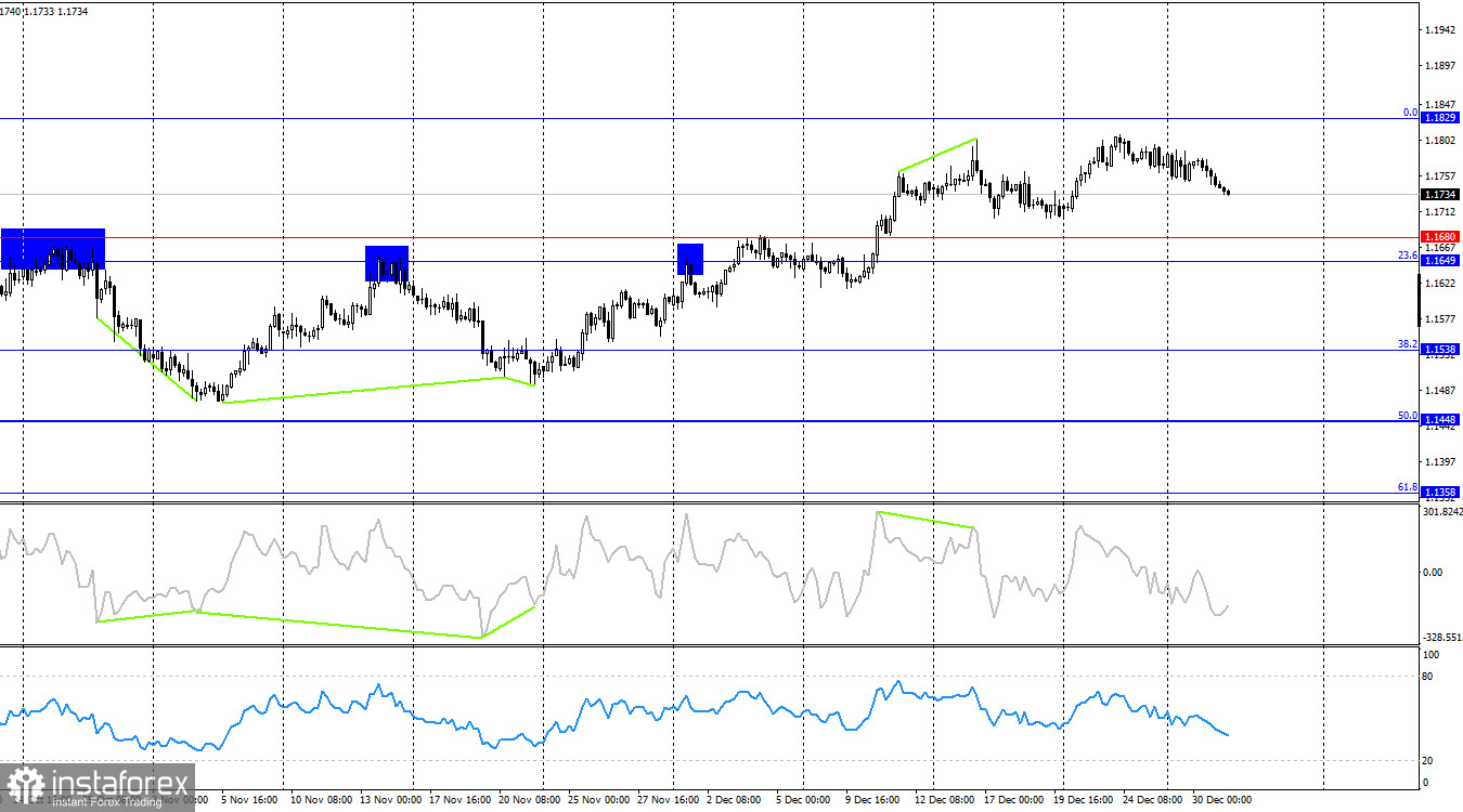 Ситуация с волнами на часовом графике остается простой. Последняя завершенная волна вверх не пробила пик предыдущей волны, а новая волна вниз пока не пробила предыдущий лоу. Таким образом, тренд официально остается «бычьим». Назвать его сильным язык не поворачивается, но в последние недели быки воспряли духом, а затем начались праздники. Смягчение ДКП ФРС будет оказывать давление на доллар в 2026, а ЕЦБ не создаст никаких проблем евровалюте. «Бычий» тренд завершится в случае закрепления пары под уровнем 1,1718 и последними тремя лоу.