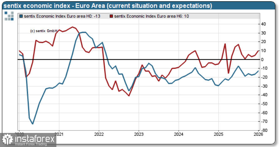 Индикатор уверенности инвесторов Sentix вырос в январе на 4.4п до -1.8п, это самый высокий уровень с июля 2025 г. Рост индекса в первую очередь обусловлен ростом ожиданий, которые стали гораздо более позитивными, оценка текущей ситуации пока слабая, но также имеет восходящую тенденцию.