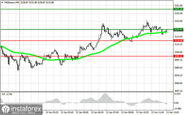 Сценарий №2: покупать эфир можно от нижней границы $3118 при отсутствии рыночной реакции на ее пробой в обратную сторону к уровням $3132 и $3157.