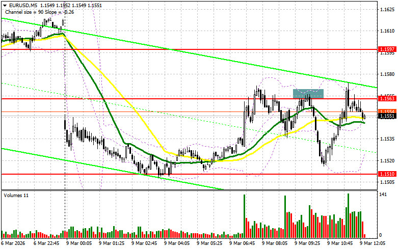 В своем утреннем прогнозе я обращал внимание на уровень 1.1563 и планировал от него принимать решения по входу в рынок. Давайте посмотрим на 5-минутный график и разберемся с тем, что там произошло. Рост и формирование ложного пробоя в районе 1.1563 привели к точке входа на продажу евро, что вылилось в падение пары на 40 пунктов. На вторую половину дня техническая картина не пересматривалась.Для открытия длинных позиций по EURUSD требуется:Данные о резком сокращении объема заказов в промышленности Германии сразу на 11%