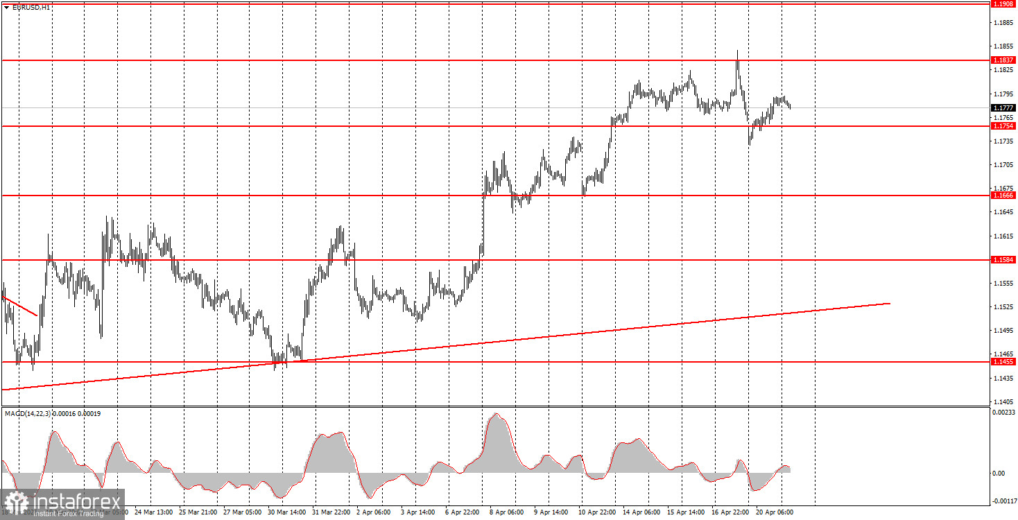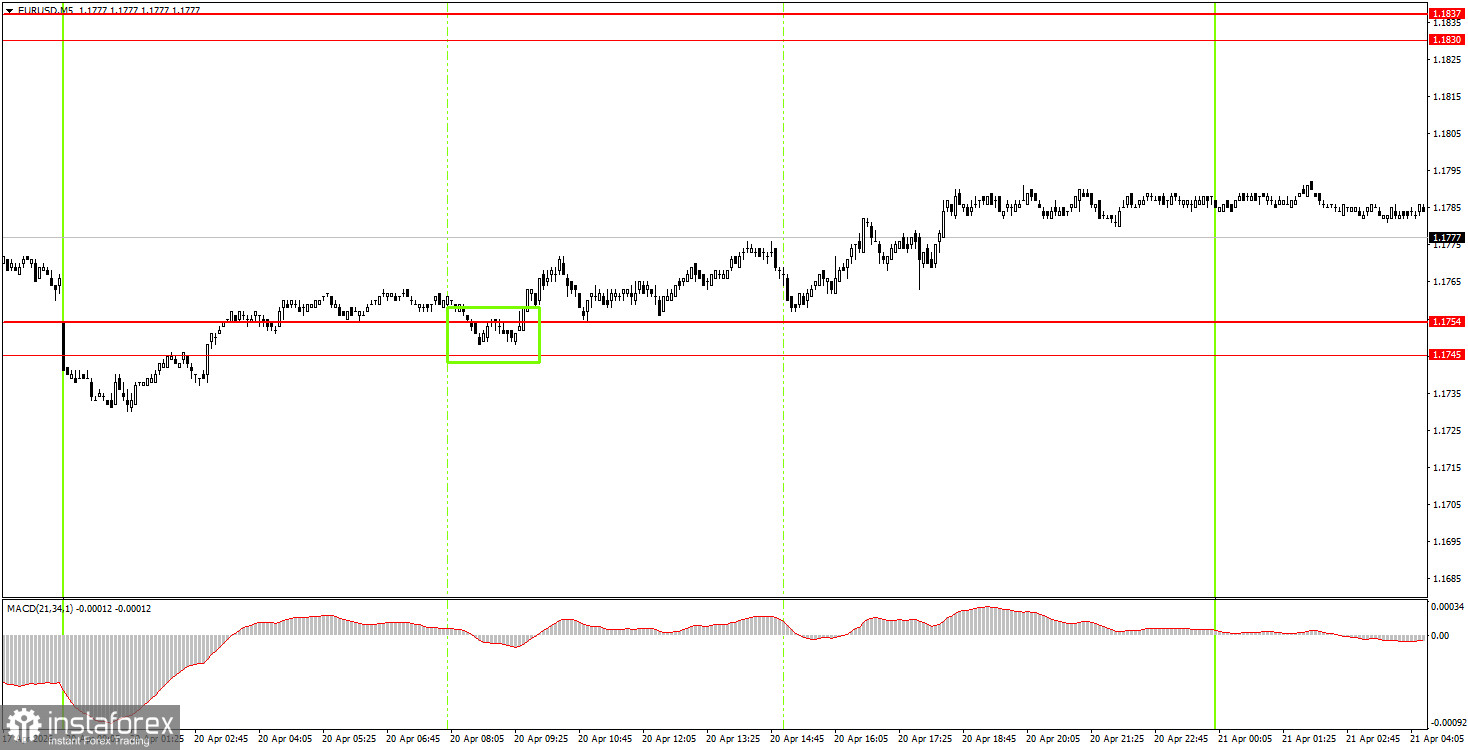 На 5-минутном ТФ в понедельник был сформирован только один торговый сигнал – на покупку. Цена в самом начале европейской торговой сессии отскочила от области 1,1745-1,1754 и до конца двигалась только в одном направлении – северном. Таким образом, к концу дня начинающие трейдеры могли закрыть длинную позицию вручную в прибыли около 20 пунктов.